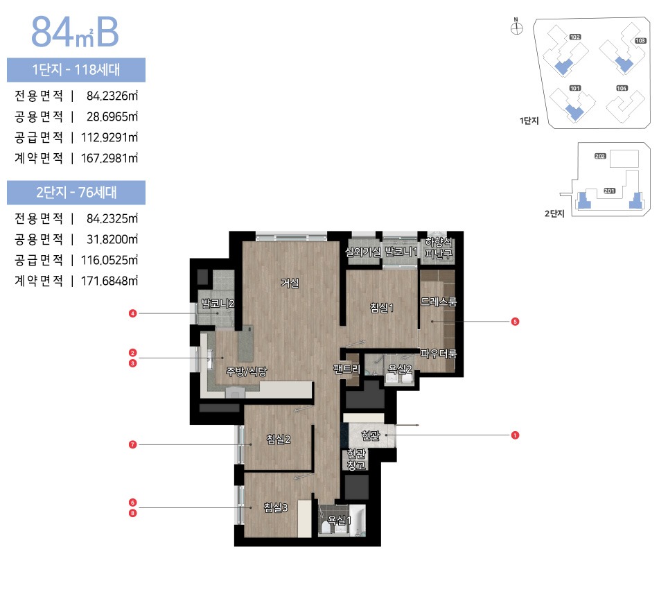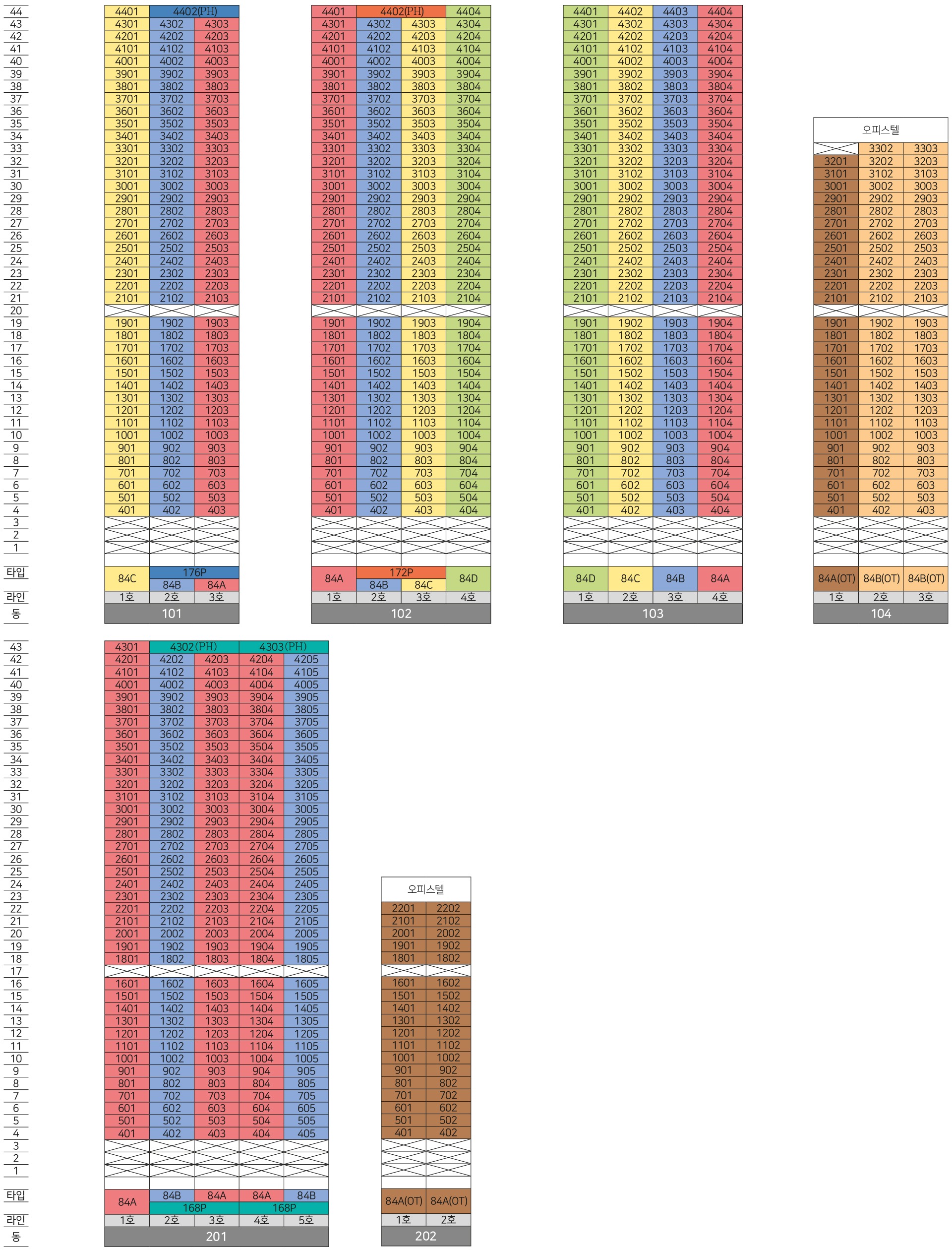 • 84㎡ (A/B/C/D): 4Bay 판상형 위주 설계로 채광과 통풍 극대화, 드레스룸 및 팬트리 특화